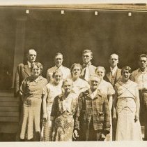 Three photos, two apparently taken the same day, showing Robert and Mecie Burns, apparently with all of their eight children and some spouses? No date or IDs shown. For comparison, Figure 9-47 from Jack's History of Fall City is included in images. And a third a formal portrait showing the family in c1905. a - Family members standing at an angle on the steps to the Burns house (?) Print is stored. b - Same group of people, in same order, but all facing forward on the steps Only digital scan is stored for this photo, but image included here. c - Portait of family c1905 |